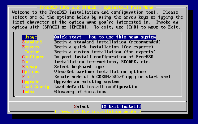 これで道具は揃った.まっさらなHDDを積んだPCとFreeBSDのインストールCDがあることを確認しよう. 確認したら,CDをCD-ROMドライブに入れて起動しよう.起動メッセージがわんさかと出てくるはずだ. そうでなければ,BIOSの設定がおかしい可能性がある.パソコン,あるいはパーツの説明書を読んでCD-ROM bootができるように,BIOSの設定を変更しよう.アスキー・アートでFreeBSDのしょぼいlogoが出てくればinstall CDでのbootは成功だ.ただenterキーを押してもよし,そのまま放っておいてもよし, Bootプロセスはデバイスの検出に進むはずだ.ここでまた大量のメッセージが出てくる. しばらくすると "Sysinstall Main Menu" という画面が出てくる.ここからが本当のFreeBSDのインストール・プロセスだ. 方法は色々とあるのだが,筆者のお気に入りは "Custom" installだ.思うにこのプロセスが一番直感的だし, 必要なサービスは後で手動で設定すればいいと思う.